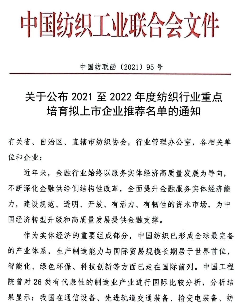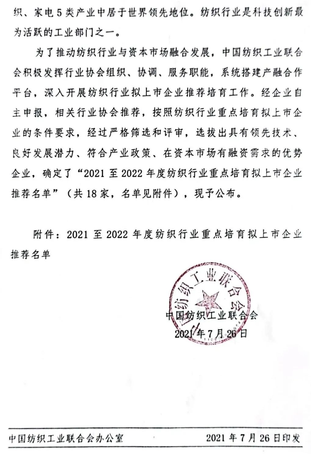 ในปีแรกของแผนห้าปีที่ 14 สภาอุตสาหกรรมสิ่งทอของจีนกำลังเร่งบูรณาการอุตสาหกรรมสิ่งทอและตลาดทุน เมื่อวันที่ 26 กรกฎาคม สหพันธ์อุตสาหกรรมสิ่งทอของจีนได้ออกประกาศเกี่ยวกับการเผยแพร่รายชื่อองค์กรหลักที่แนะนำเพื่อจดทะเบียนในอุตสาหกรรมสิ่งทอตั้งแต่ปี 2564 ถึง 2565 หลังจากการคัดกรองและประเมินผลอย่างเข้มงวด 18 องค์กรที่ได้เปรียบพร้อมเทคโนโลยีชั้นนำ มีศักยภาพในการพัฒนาที่ดี กับนโยบายอุตสาหกรรมและความต้องการทางการเงินในตลาดทุนได้รับการคัดเลือกให้เป็นรายการข้อเสนอแนะ องค์กรเหล่านี้เกี่ยวข้องกับวัสดุเส้นใยใหม่ๆ การผลิตอัจฉริยะ การก่อสร้างแฟชั่น การผลิตที่เป็นมิตรต่อสิ่งแวดล้อม สิ่งทออุตสาหกรรมระดับไฮเอนด์ และสาขาอื่นๆ ซึ่งเป็นประเด็นสำคัญที่ได้รับการสนับสนุนจากสิ่งทอ "แผนห้าปีฉบับที่ 14"
